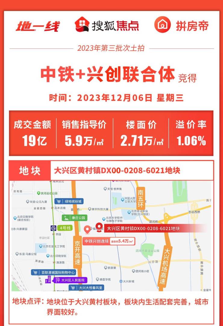 先来看看大兴区黄村镇DX00-0208-6021地块,截止报名时,一共有3家房企报名:中铁+兴创联合体、首开、住总,但是到了12月6日现场竞拍时,现场无竞买单位领取号牌,最终地块由最后一手报价单位:中铁+兴创联合体以19亿拿下,溢价率1.06%,楼面价2.71万元/㎡,销售指导价5.9万/㎡。