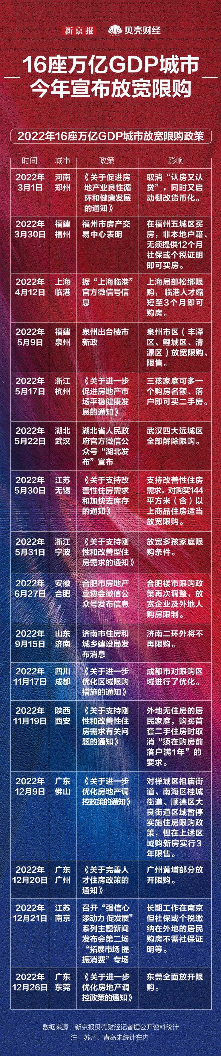 全国多地完善楼市调控政策,进一步支持刚性和改善性住房需求,促进房地产市场平稳健康发展。新京报贝壳财经用数据带你看懂,2022年还有哪些GDP万亿城市宣布放宽限购?