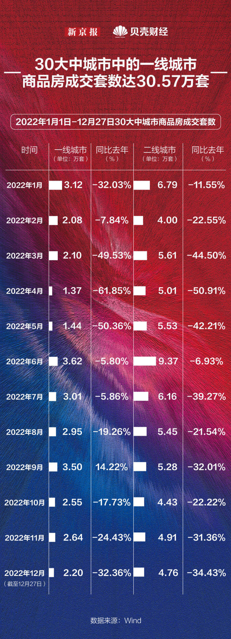Wind数据显示,2022年1月1日至12月27日30大中城市中的一线城市商品房成交套数达30.57万套,比去年同期下降25.60%;而二线城市商品房成交套数达67.30万套,同比去年下降31.16%。