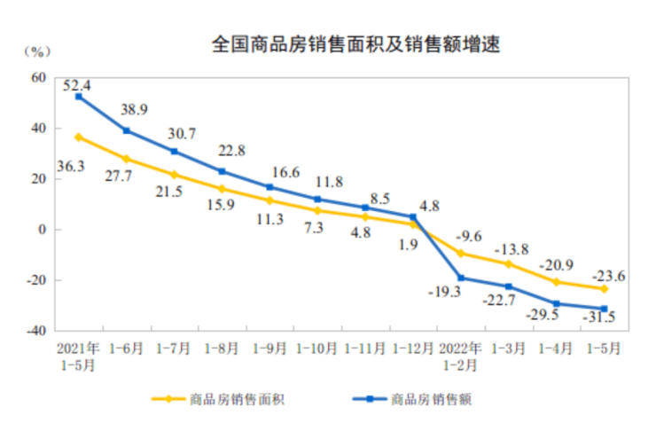 国家统计局数据显示,1—5月份,商品房销售面积50738万平方米,同比下降23.6%;其中,住宅销售面积下降28.1%。商品房销售额48337亿元,下降31.5%;其中,住宅销售额下降34.5%。