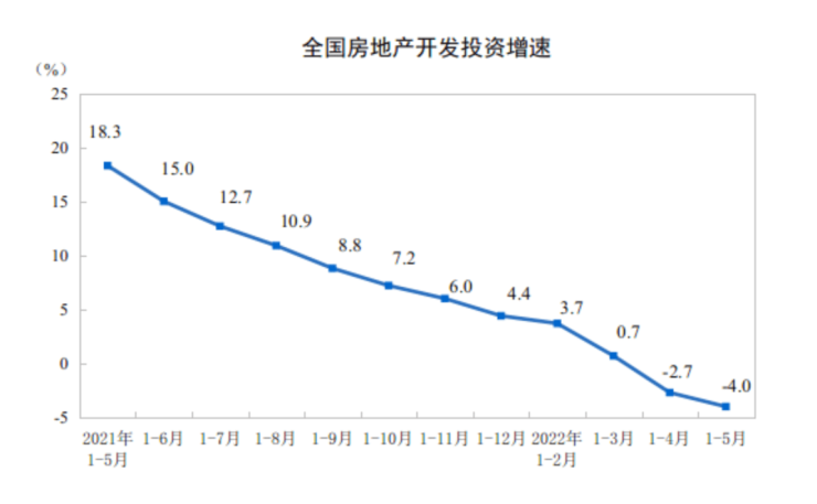 国家统计局数据显示,1—5月份,全国房地产开发投资52134亿元,同比下降4.0%;其中,住宅投资39521亿元,下降3.0%。