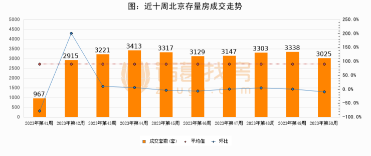 存量房方面,第50周北京存量房成交3025套,较上周减少313套,环比下降9.4%。从近十周成交走势来看,周均成交套数为2977套,本周高于平均水平1.6%。