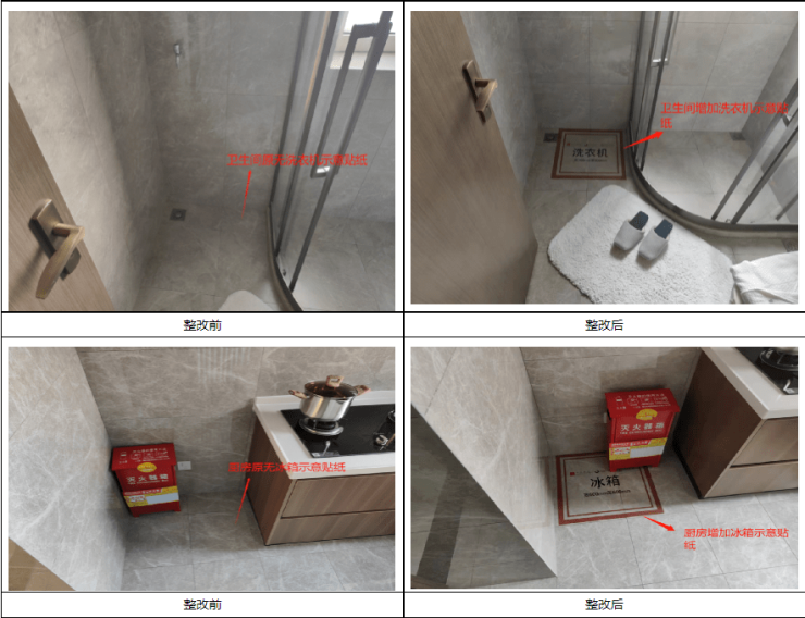 回复:原硬装户型中D-119户型、B1-89户型、A-78户型卫生间及厨房共计5处缺失表达洗衣机、冰箱位置,现补充上述户型洗衣机、冰箱位置贴纸示意图,现场整改如下图所示。