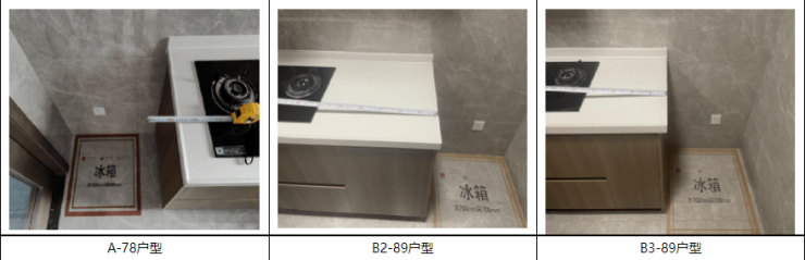 回复:经核实精装施工图纸及样板间现场情况,A-78户型、B2-89户型、B3-89户型灶台旁冰箱预留位置轮廓距燃具边缘水平间距均大于300mm(其余户型冰箱预留位置未在灶台旁),满足设计规范要求。