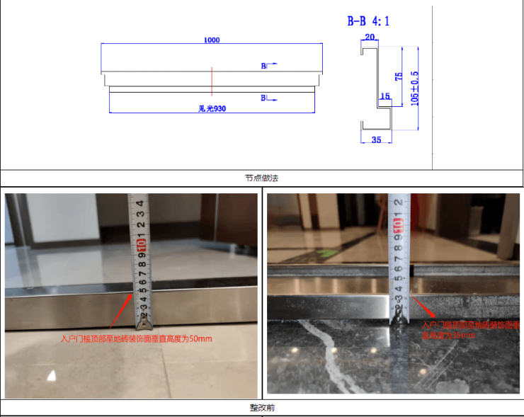 回复:本项目入户门开启方式有内开及外开两种开启形式,且均采用下图门槛节点做法。其中外开及内开入户门门槛顶部至地砖装饰面垂直高度原设计较大值为50mm,最小值为35mm;现将样板间(A-78户型、B1-89户型、B2-89户型、B3-89、C-113户型、D-119户型)共计6种户型入户门进行优化,门槛顶部至地砖装饰面垂直高度较大值调整为35mm,最小值为20mm;调整后门槛节点详见下图。