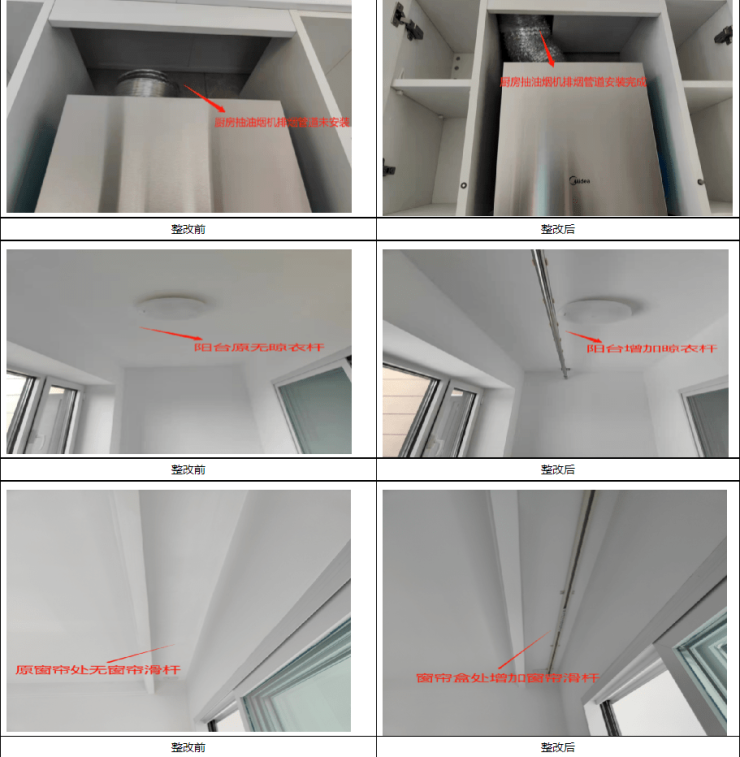 2、已对厨房集成吊顶进行优化,重新排布烟道上方吊顶龙骨布局,确保排烟管道安装至吊顶内;3、A-78、B1-89、B2-89、B3-89、C-113、D-119户型共计6户厨房下水安装到位,A-78、B1-89、B2-89、B3-89、C-113、D-119户型共计6户增加阳台晾衣杆、卫生间置物架、窗帘盒滑杆。