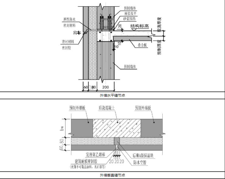 回复:预制三明治外墙板接缝,有多道防水措施,可保证防水效果,具体为水平横缝采用企口形式,最外侧采用聚乙烯棒及建筑耐候密封胶防水,中间部分为物理空腔形成的减压空间,内侧采用现浇混凝土及灌浆层封堵的结构防水措施。节点图如下: