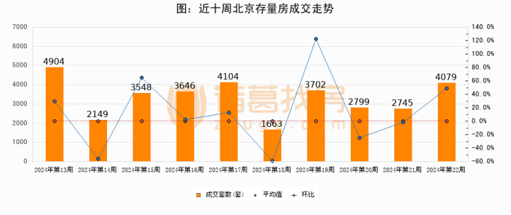 存量房方面,第22周北京存量房成交4079套,较上周增加1334套,环比上涨48.6%。从近十周成交走势来看,周均成交套数为3333套,本周高于平均水平22.4%。