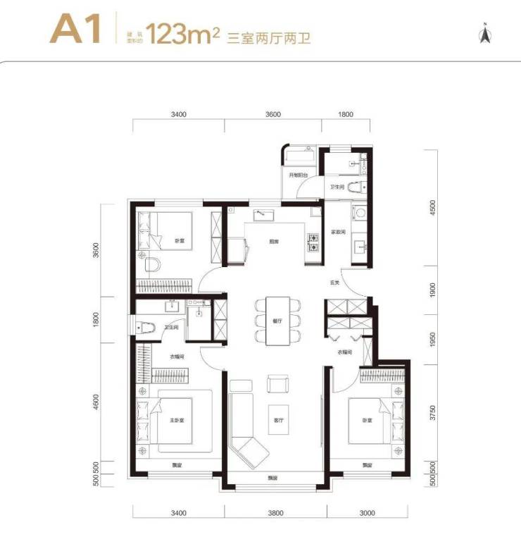 建面约123平米三居,南向三面宽,客厅面宽约3.8米,LDK近等宽空间更加朗阔通透;主卧套房设计,两次卧面积都在12平以上,尺度足够;北向家政间+次卫+开敞阳台,组成复合功能区,户型实用。