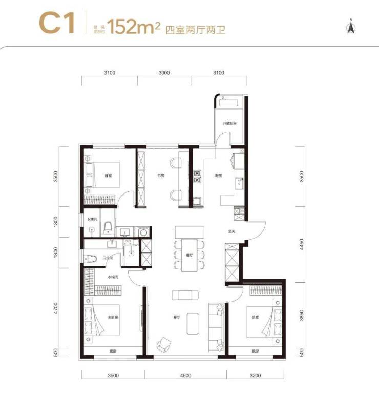 建面约152平米四居,户型全明,南客厅面宽做到4.6米,搭配大落地窗视野极佳;北向空间毫不局促,卧室挨着书房,可根据不同家庭需求灵活设计;另外厨房+开敞阳台,增强收纳。