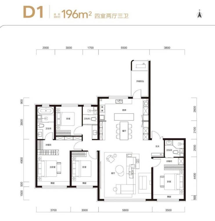 建面约196平米四居,黄金四面宽,5.8米宽厅+近等宽餐厨空间,共近68平米社交空间豪气十足;南向三个卧室、双套房,星级主卧贯通南北,带有浴缸;客卫临近两次卧,让生活起居更加便捷。奢阔大宅谁看谁心动!