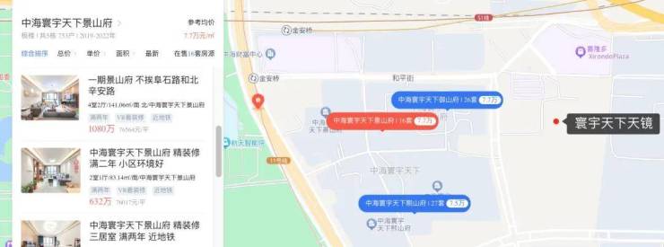 目前寰宇天下的一、二、三期,二手房挂牌价在7.5-7.7万/平米之间,南侧不远处有次新中海今玺公馆、金石公馆,挂牌价在6.9-7.1万/平米之间。