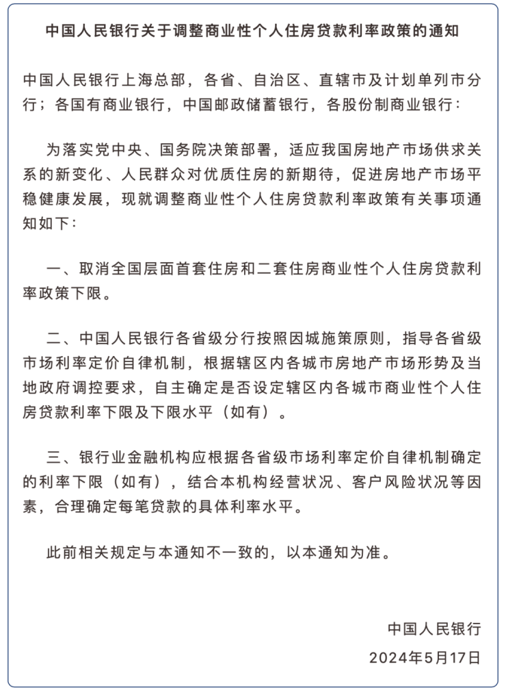 一、取消全国层面首套住房和二套住房商业性个人住房贷款利率政策下限。
