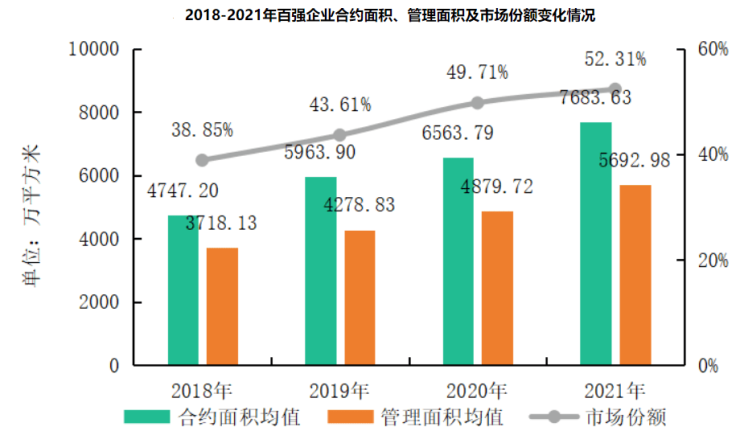 据中指研究院数据,2021年百强物业企业管理面积达到5692.98万平方米,同比增速达16.69%;合约管理面积增至7683.63万平方米,高出管理面积近2000万平方米,奠定了未来增长的坚实基础。市场份额方面,百强企业市占率上升至52.31%,较上年增长2.60个百分点。