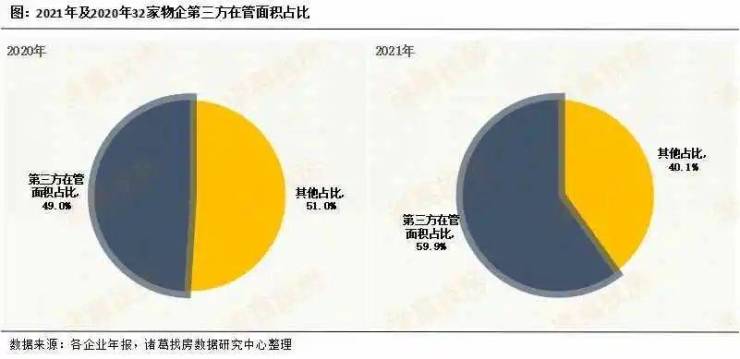 诸葛找房数据研究中心统计显示,50家物企中有32家公布了第三方拓展数据,2021年32家物企第三方在管面积占比由49%提升至59.9%,扩大了10.86个百分点。