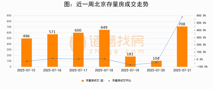 从存量房来看,2025年07月21日北京存量房单日成交708套,比昨日增加604套,环比上涨580.8%。从近一周存量房成交来看,北京存量房日均成交套数为472套,07月21日单日成交708套,高于近一周平均水平50%。
