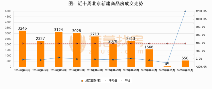 进入2025年第06周(02月03日-02月09日),北京新建商品房成交556套,较上周增加513套,环比上涨1193%。从近十周成交来看,周均成交套数为2099套,本周成交556套,低于近十周平均成交量73.5%。