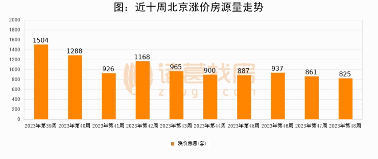 从调价房源来看,第48周北京涨价房源825套,较上周下降4.2%。与此同时,48周涨价房源占比回落0.45个百分点,业主信心小幅波动,购房者可则需入市。