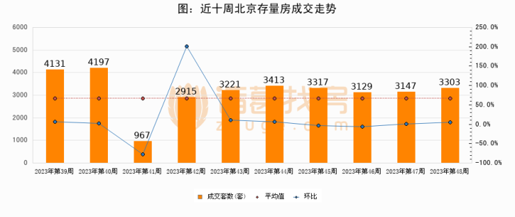 存量房方面,第48周北京存量房成交3303套,较上周增加156套,环比上涨5%。从近十周成交走势来看,周均成交套数为3174套,本周高于平均水平4.1%。