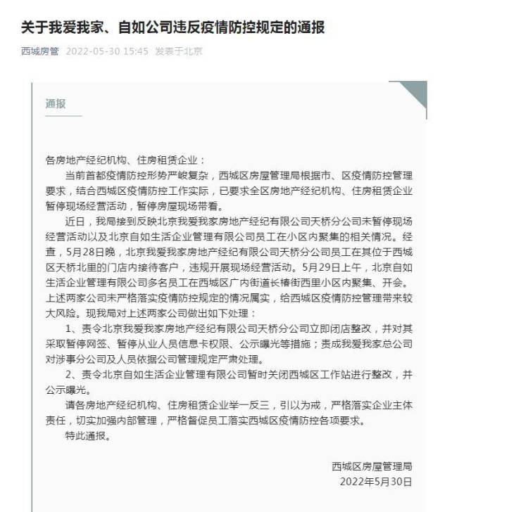 北京市西城区房屋管理局30日发布关于我爱我家、自如公司违反疫情防控规定的通报。