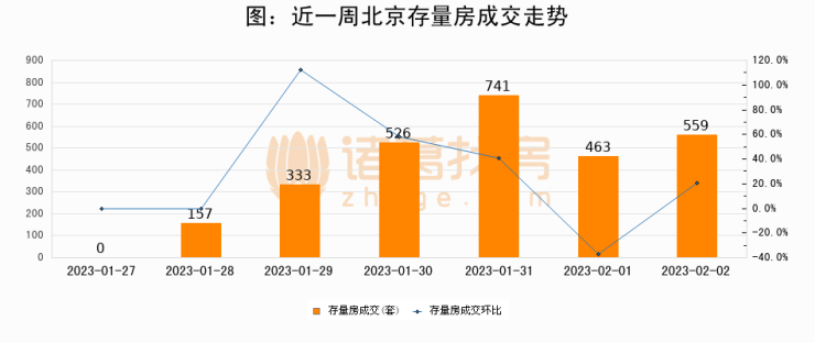 从存量房来看,2023年02月02日北京存量房单日成交559套,比昨日增加96套,环比上涨20.7%。从近一周存量房成交来看,北京存量房日均成交套数为397套,其中01月31日成交量最高为741套,02月02日单日成交559套,高于近一周平均水平40.8%。