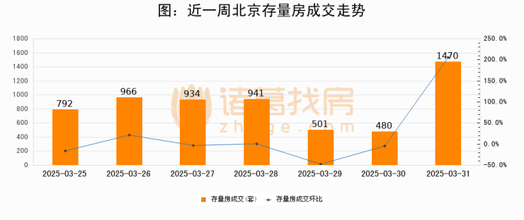 从存量房来看,2025年03月31日北京存量房单日成交1470套,比昨日增加990套,环比上涨206.2%。从近一周存量房成交来看,北京存量房日均成交套数为869套,03月31日单日成交1470套,高于近一周平均水平69.2%。