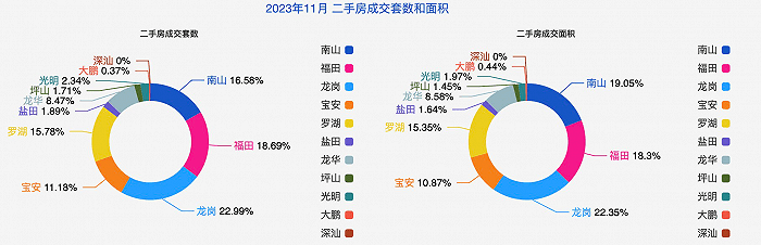 在二手房市场上,据深圳市房地产中介协会统计,截至12.11-12.17的一周,深圳二手房已经连续三周成交破千。据深圳住建局统计,11月深圳二手房成交量最高的区域,分别是龙岗、福田和南山三个区域,合计占比58.26%。