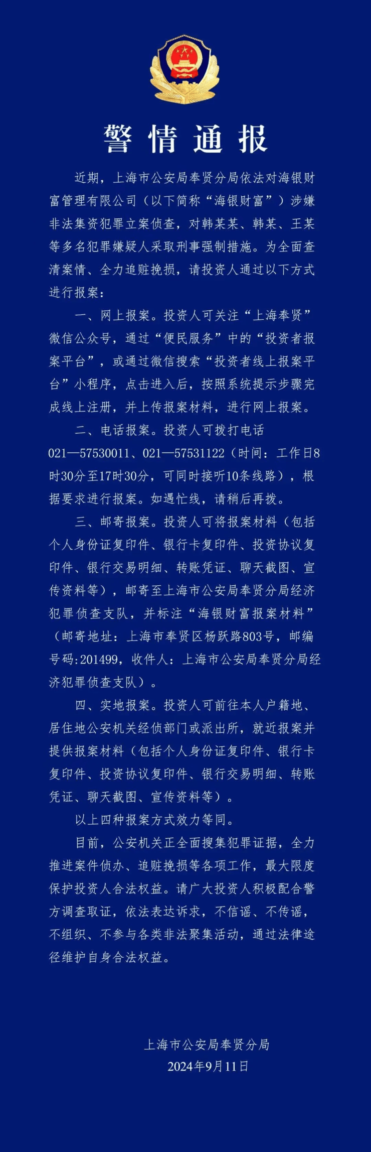 9月11日,上海市公安局奉贤分局发布警情通报。通报称,依法对海银财富管理有限公司涉嫌非法集资犯罪立案侦查,对韩某某、韩某、王某等多名犯罪嫌疑人采取刑事强制措施。目前公安机关正全面搜集犯罪证据,全力推进案件侦办、追赃挽损等各项工作,最大限度保护投资人权益。