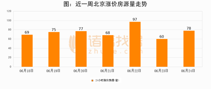 根据诸葛找房数据显示,北京24小时涨价房源量为78套,较06月23日增加18套,环比上涨30%。与此同时,涨价房源占比小幅扩大,业主信心有所提升。