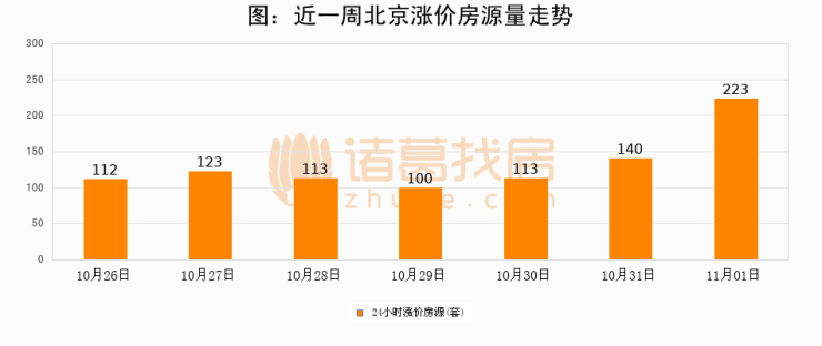 根据诸葛找房数据显示,北京24小时涨价房源量为223套,较10月31日增加83套,环比上涨59.3%。与此同时,涨价房源占比小幅扩大,业主信心有所提升。