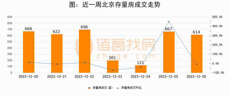 从存量房来看,2023年12月26日北京存量房单日成交614套,比昨日减少53套,环比下降8%。从近一周存量房成交来看,北京存量房日均成交套数为512套,12月26日单日成交614套,高于近一周平均水平19.9%。
