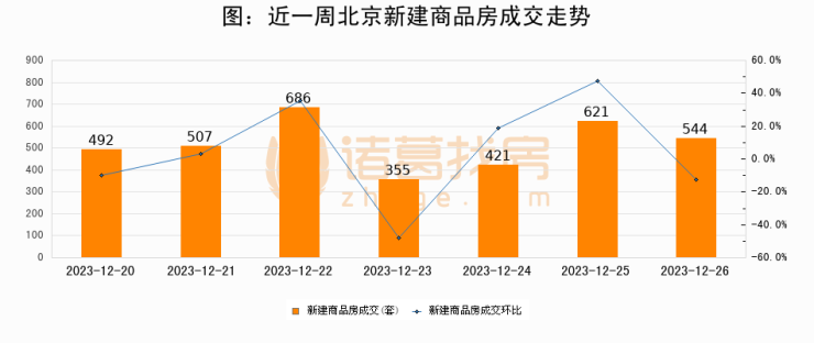 根据北京市住房和城乡建设委员会数据显示,2023年12月26日北京新建商品房成交544套,较昨日减少77套,环比下降12.4%