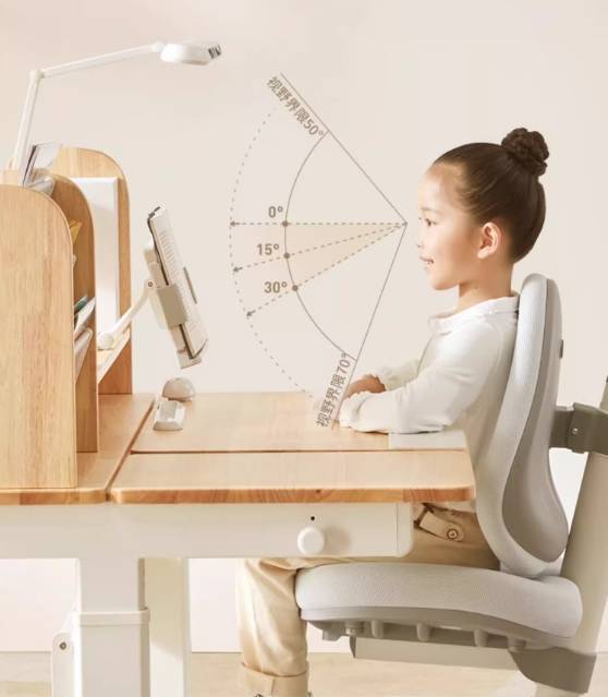 光明园迪专业儿童学习桌椅,拥有创新小C口,让孩子坐在学习桌前,身体前进7CM进入小C口,双臂自然下垂至桌面,学习姿态最标准。全视阅读架可上下前后移动,将书本放置在阅读架上,将左手压书,右手写字的左右用眼,改为上看下写,而且视野范围可以控制在最佳的15-30°;看书时眼睛距离书本50公分左右,写字时眼睛距离桌面33公分,上下用眼,一远一近产生视距差,锻炼睫状肌,呵护视力健康。同时,光明园迪学习桌均有倾斜桌面设计,学习桌右侧的角度显示器会显示桌面倾斜度数,对应不同学习场景。0°手工,12书写,30°阅读,40°绘画,精准匹配每种学习模式,提升孩子专注力。105和120尺寸还设有陪读区,父母陪读、辅导作业更方便。