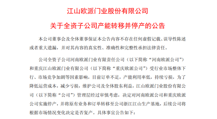 江山欧派的战略调整直接而彻底。2025年10月底,这家定制家居企业宣布关闭位于河南和重庆的两家生产基地,将所有业务订单转移至浙江江山基地。