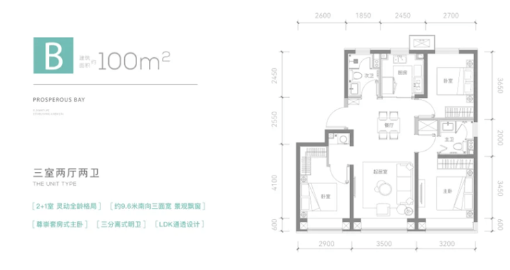 建面约100㎡全家欣喜的灵动大三房,打造LDK通透空间,连接有爱的家庭关系场。三房布局、动静分离,亦让亲疏距离收放自如。