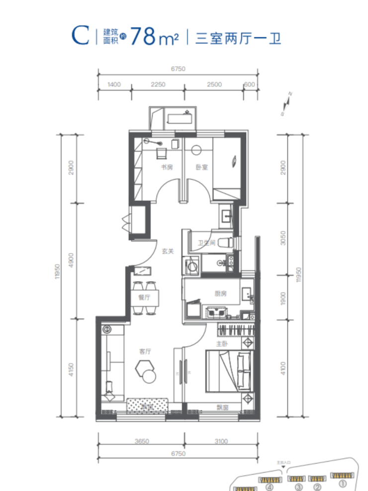 接下来看看北京城建·国誉燕园的78平户型,做成了三居室设计,主打功能性三居。南向客厅面宽达到3.65米,这面宽在七十多平的的户型当中已经算是非常优秀的了。北向两个卧室交房的时候是有隔断的,但是中间的隔断是非承重墙,可以根据需求打通,变成一个两居室。卫生间是明卫,干湿分离,可以很好的避免潮湿。餐厅和厨房紧挨着,方便端菜端饭,动线合理。这个户型可变动比较强,如果家里人可多,可以当三居,如果小两口居住那就改成两居室也是不错的。