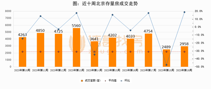 存量房方面,第19周北京存量房成交2958套,较上周增加469套,环比上涨18.8%。从近十周成交走势来看,周均成交套数为4147套,本周低于平均水平28.7%。