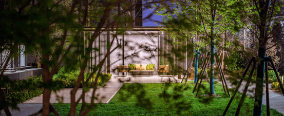中建·京西印玥,以全冠植入元宝枫、蒙古栎、银杏、国槐、白蜡等绿植。黄昏时分,人们沿林荫道悠然漫步,银杏夹道,层次分明,绿树成荫。转身步入草坪空间,有叠水树影,还有丝丝花香,叠水景观交融园林艺境,延伸绿意园境。华灯初上之时,当朦胧月色撒满花前林间,漫赏水光与月光休戚与共,俯仰倒影在水中的万家灯火,刹那间,宁静之感从心头油然而生。