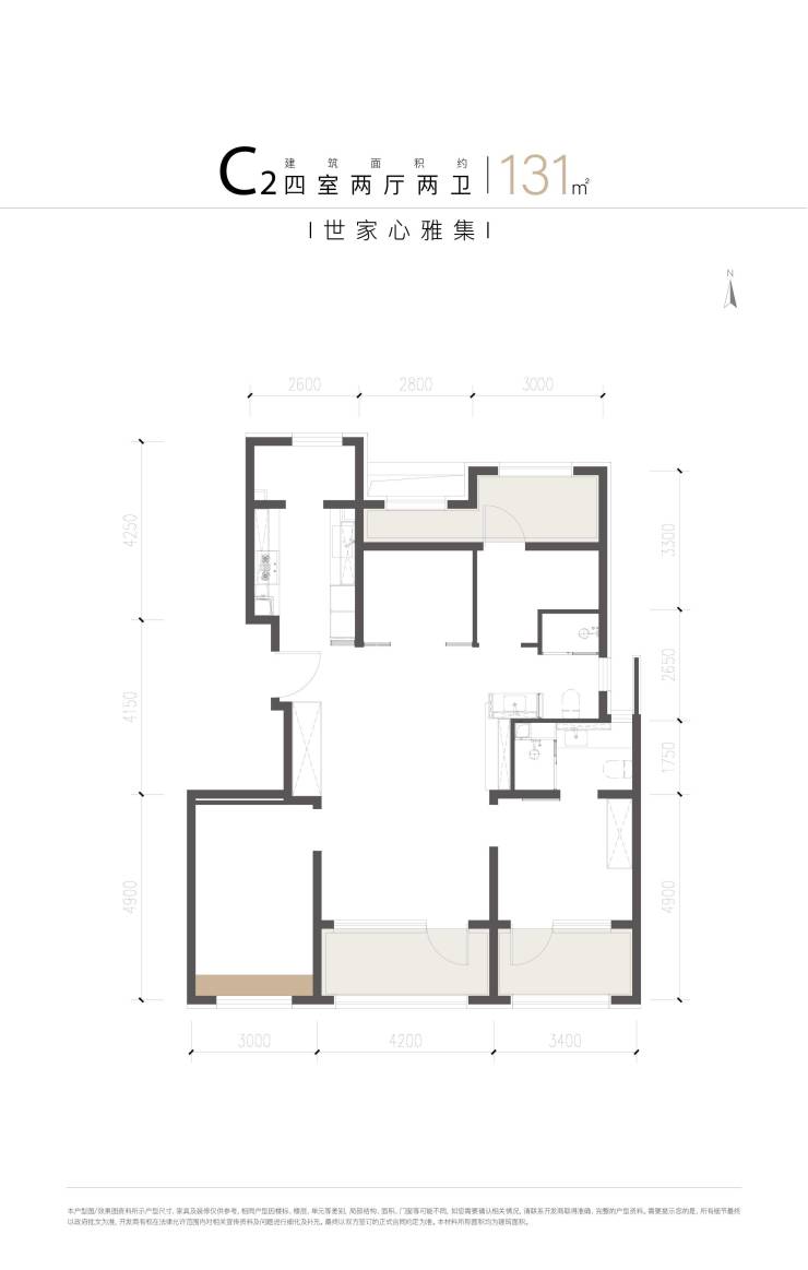 131㎡四居:以“客厅面宽约4.2米+ 主卧270°全景窗” 的设计,主卧面宽3.9米, 配备270°转角全景窗,西侧是飘窗,主卫和客卫都有飘窗的赠送;北向两间卧室面宽分别是2.8和3米,厨房的北侧设计了家政间。
