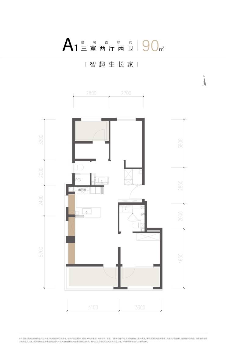 90㎡三居:采用“强互动厨房+270°环幕厅”的设计,客厅面宽4.1米,西侧从客厅一直延伸到厨房都有飘窗赠送;主卧面宽3.3米,打造带独立卫浴的酒店式套房;北向两间卧室面宽分别为2.8、2.7米,其中一间卧室有设备平台的赠送。