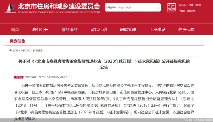 买的期房还没交付,开发商却没钱还债了,如何防止楼盘“烂尾”,保证购房人的合法权益?为进一步加强商品房预售资金监督管理,保证商品房预售资金优先用于工程建设,切实维护商品房交易双方合法权益,12月22日,北京市住建委发布《北京市商品房预售资金监督管理办法(2023年修订版 公开征求意见稿)》(以下简称“《办法》”),面向社会公开征求意见。