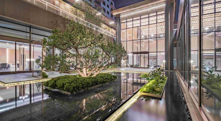 在实景示范区内约1500平方米的下沉庭院会所内,精致卡座、绿景点缀之外,中建·玖玥府打造了高约12米的垂天之瀑,直击参观者内心,大自然的气息扑面袭来。坐在这里观景、听瀑,带来的不止是内心的沉静,更是对精神的滋养。