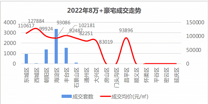 合硕机构数据显示,由于2022年内城优质地块的集中供应,五环以内豪宅成交最活跃。其中,海淀区位列8万+豪宅成交套数榜首,共成交3359套,成交均价为9.3万/㎡。除东西城外,丰台成交均价最高,为10.2万/㎡。