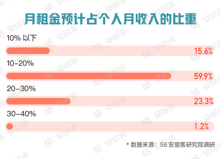 调研数据显示,约六成租房者认为月租金占个人/家庭月收入的比重在10%-20%较为合适,能够使经济压力和居住条件达到相对平衡。
