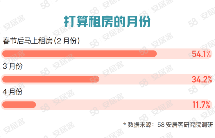 根据58安居客研究院统计, 本次调研面向今年4月份之前有租房需求的人群,接受调研的人群中,有54.1%的受访意向租客希望在春节后(2月份)马上租房,有34.2%的人希望在3月份租房。