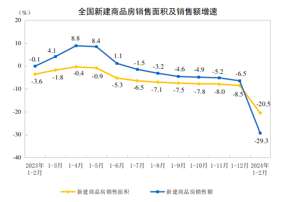 销售方面,1-2月份新建商品房销售面积11369万平方米,同比下降20.5%,其中住宅销售面积下降24.8%;新建商品房销售额10566亿元,下降29.3%,其中住宅销售额下降32.7%。