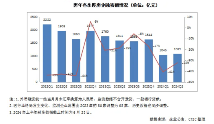 另据克而瑞数据,从历年65家典型房企的融资总量来看,2024年上半年融资总量为2131亿元,同比下降37%。从季度表现来看,一二季度分别同比下滑了41%及32%。