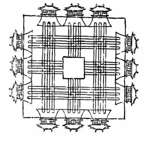 营建都城,九里见方,每边开三道门,