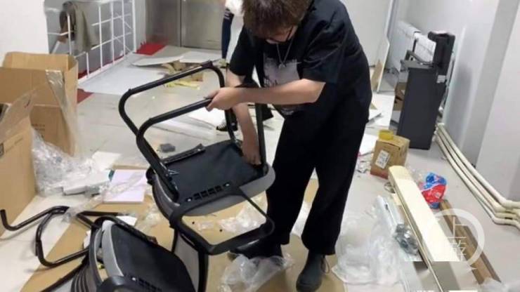 ▲2021年4月,郑前的房产中介公司开张,郑前自己动手组装办公桌。图片来源/受访者供图