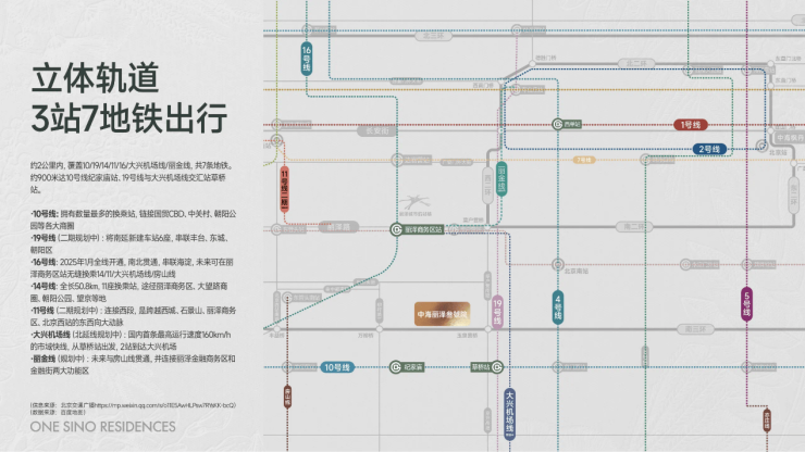 地铁黄金三角:900 米达 10 号线纪家庙站(换乘之王),1.3 公里至 19 号线草桥站(南北快线),1.6 公里抵丽泽商务区站(五轨交汇),未来通过丽金线 10 分钟直达金融街,交通便利性对标朝阳公园板块。